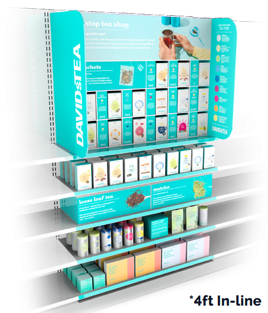 The DAVIDsTEA 4ft In-Line display is a vibrant and well-organized retail unit designed to showcase a variety of DAVIDsTEA products. This display aims to attract tea enthusiasts by offering a comprehensive selection of teas and tea-related products in an aesthetically pleasing and informative manner.